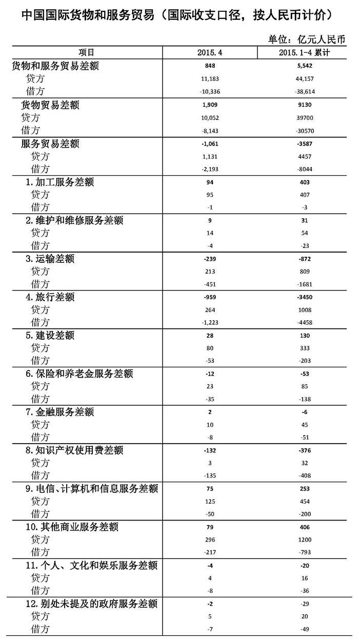 ????????2015年4月,我國國際收支口徑的國際貨物和服務(wù)貿(mào)易收入11183億元,支出10336億元,順差848億元。其中,貨物貿(mào)易收入10052億元,支出8143億元,順差1909億元;服務(wù)貿(mào)易收入1131億元,支出2193億元,逆差1061億元。