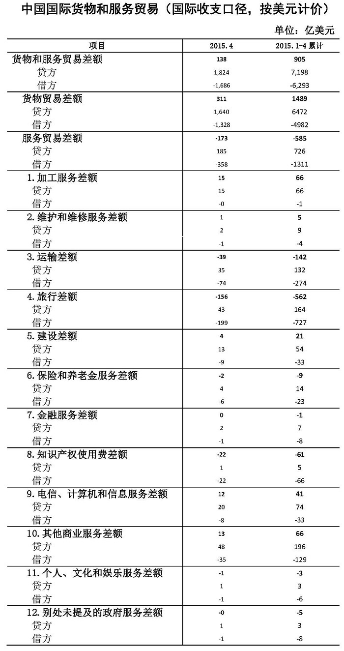 ????????按美元計(jì)價(jià),2015年1-4月,我國國際收支口徑的國際貨物和服務(wù)貿(mào)易收入7198億美元,支出6293億美元,順差905億美元。