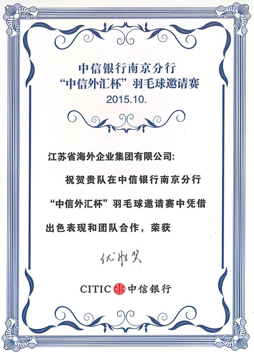 ????????由中信銀行南京分行主辦的“2015中信外匯杯”羽毛球邀請賽于2015年10月30日在南京市體育學院體育館完美落幕。我司受中信銀行邀請,派出以財務部為主力的團隊,代表江蘇省海外企業集團有限公司參加本次比賽。我司參賽的各位隊員發揮出色,憑借默契的配合和努力的拼搏,經過多輪的角逐最終取得第五名的佳績,榮獲中信外匯杯羽毛球邀請賽優勝獎。