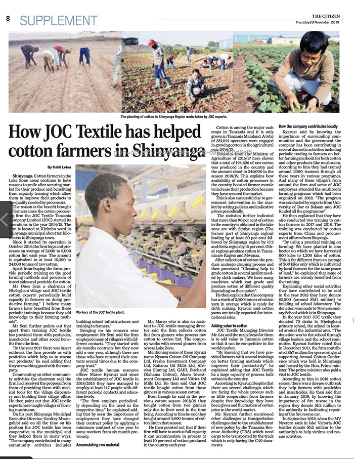 ????????2019年11月28日,坦桑尼亞主流報(bào)刊媒體MWANANCHI(《公民報(bào)》)分別在其斯瓦西里語報(bào)紙MWANANCHI及英文報(bào)紙CITIZEN上同時(shí)整版刊登江蘇-新陽嘎農(nóng)工貿(mào)產(chǎn)業(yè)園暨區(qū)內(nèi)企業(yè)海企紡織(坦桑尼亞)有限公司近幾年來通過棉花種植培訓(xùn)、紡織技能培訓(xùn)、公益捐助等方式為周邊農(nóng)戶、工廠員工和所在區(qū)域政府帶來惠利的事跡。
