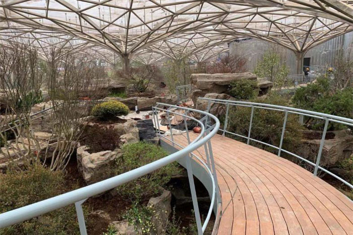 ????????另一個(gè)重點(diǎn)項(xiàng)目——植物園,以亞克力材質(zhì)的傘形建筑而聞名,總共有42把巨大傘狀建筑,占地約1000平方米。事實(shí)上,亞克力材質(zhì)是一種極脆而致密的材料,因此現(xiàn)場施工和維護(hù)非常困難,但更可貴的是,通過科學(xué)的設(shè)計(jì),在雨傘上方設(shè)計(jì)了一條水流,利用水對(duì)于光的吸收和反射特性,以及亞克力材料的隔熱特性,保證了園內(nèi)綠色植物的采光需求的同時(shí),隔絕多余熱量,形成自然空調(diào)。